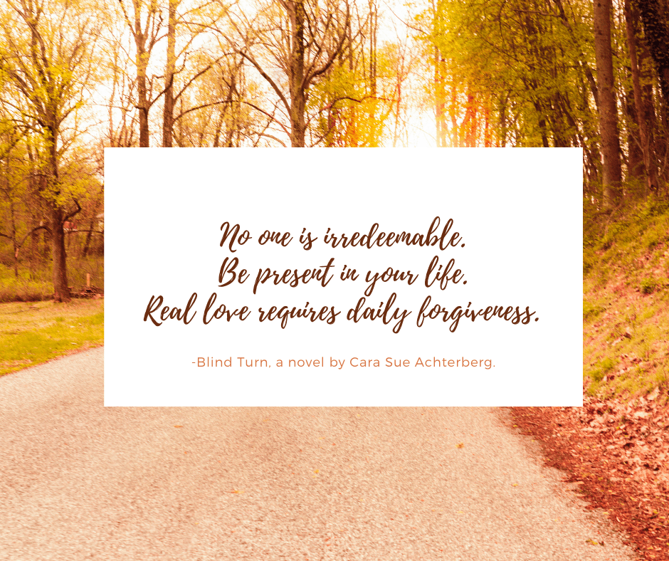 Blind Turn is a story that sums up my own philosophies about life—everyone deserves a second chance and no one is irredeemable; we need to be present in all the moments of our life and conscious of the fact that any single moment can change everything; and more than anything, real love requires forgiveness on a daily, sometimes hourly, basis.